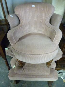 A 19th/20thC mahogany upholstered wing back chair and a pink upholstered nursing chair.