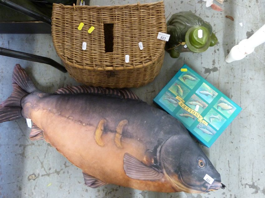 Novelty carp pillow, fisherman figure, creel etc