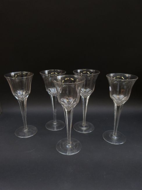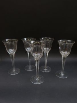 Fifteen pieces of clear glassware including a set of five wine glasses with cut stems (23cm tall), etched goblets, decanters etc