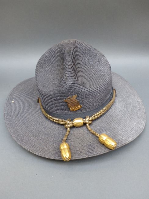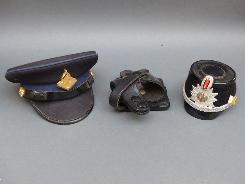 American police hats including New York, Indiana wide brimmed hat, miniature hats and a holster