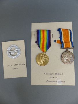 A pair of WWI medals awarded to 29964 PTE A.G Towill G.GDS, WWII medals with box addressed to R.Towill, Welsh Guards cloth and metal cap insignia, enamel badges including a hallmarked National Union of Railwaymen 30 years membership badge, paperwork relating to Private Towill's demobilisation etc