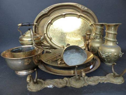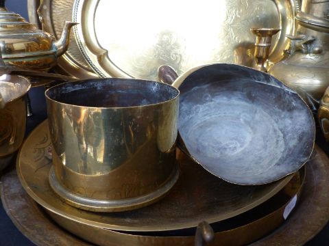 A quantity of brassware including a WWI trench art shell case