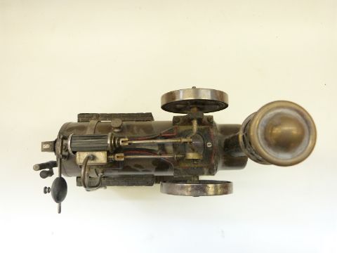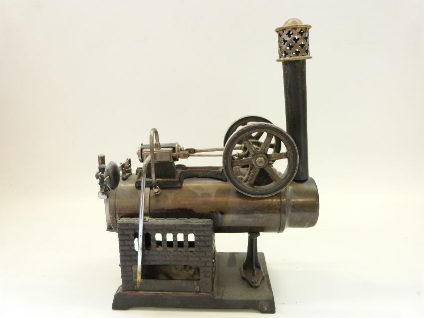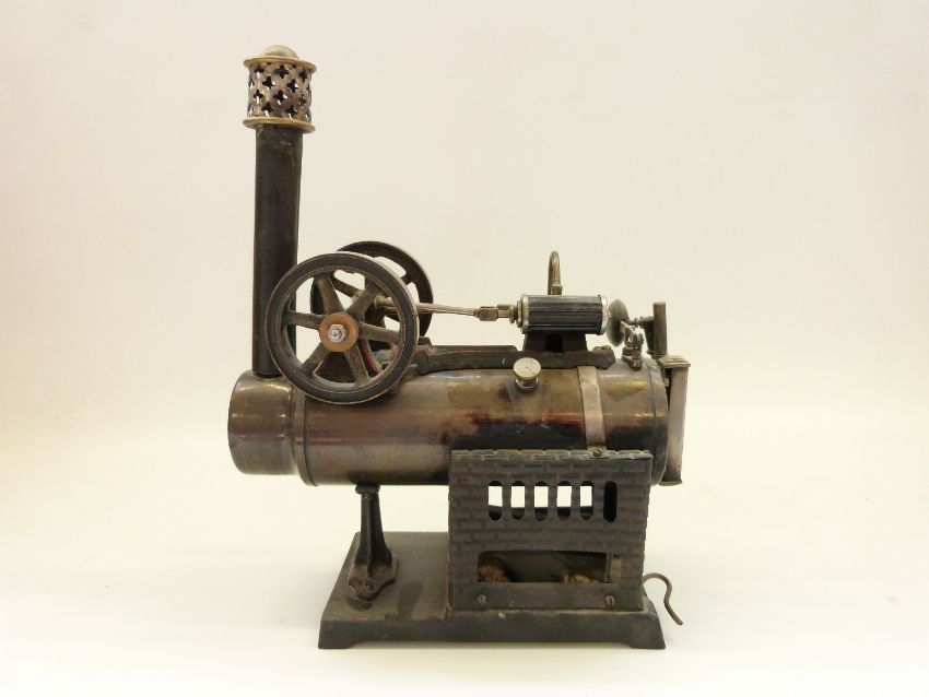 Doll overtype live steam stationary steam engine with fixed cylinder, twin flywheels, sight glass, whistle and chimney, c1930