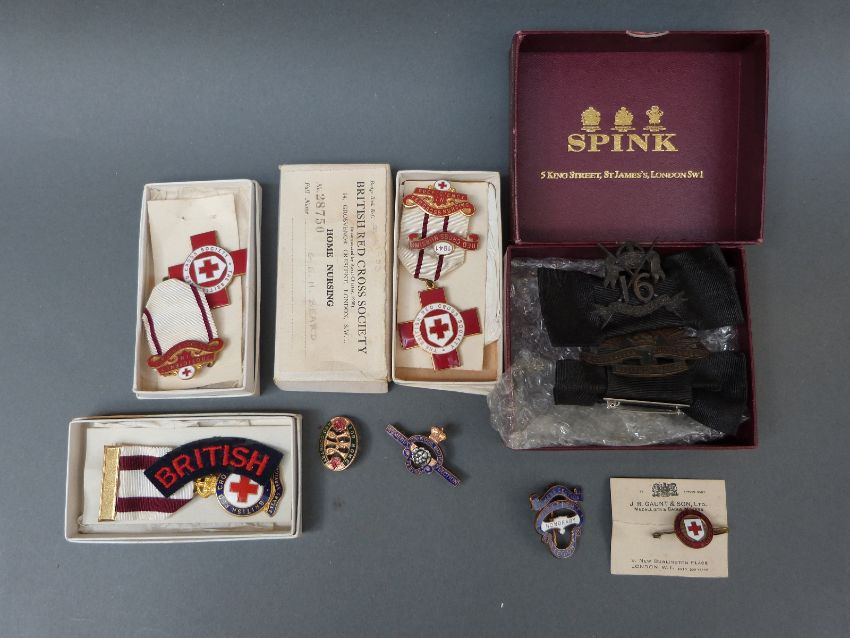 Sixteenth Lancers cap badge Australian Commonwealth Military Forces badge, 1941 and other Red Cross badges, British Legion womens section badges, etc.
