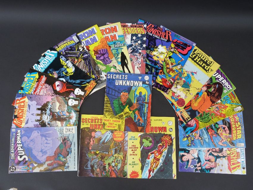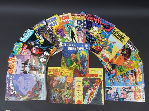 A quantity of comics to include 'Secrets of the Unkown', numbers 136,137, 147, Marvel Comics 'The Punisher', Iron Man, Sgt Fury and his Howling Defenders together with D.C Comics 'The Adventures of Superman', Action Comics, 'Superboy' etc