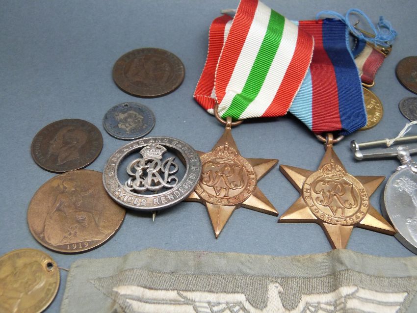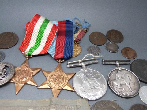 A 1914 Christmas tin containing a WWI medal awarded to 248012 Pte. F.W. Maisey 2 Lond. R. King and Empire badge marked B100404, WWII medal trio including Italy star, Nazi German fabric patch and a quantity of 17th-19thC world coinage including Charles II silver example
