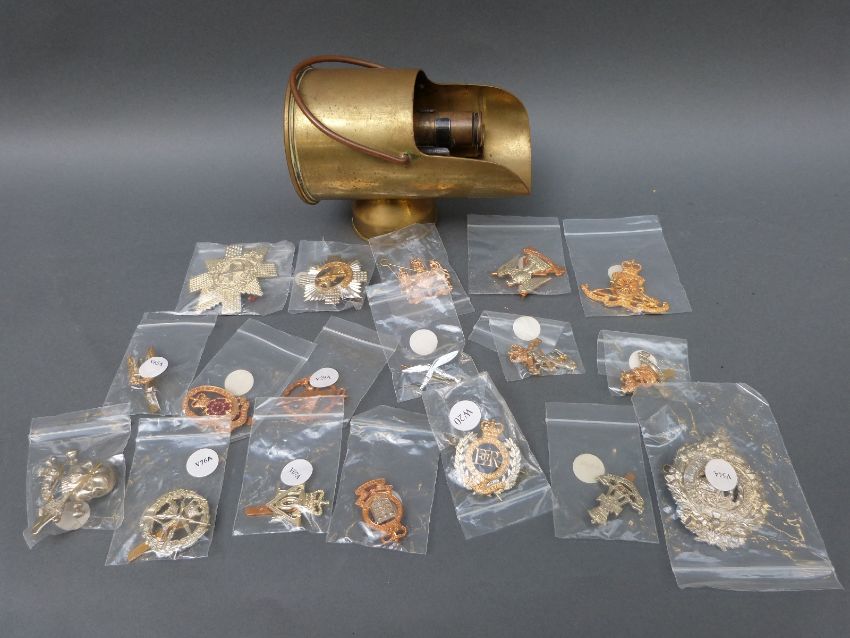 Over 15 British Army cap badges including SAS, Gurkas, 17th/21st Lancers etc and trench art