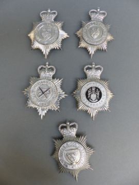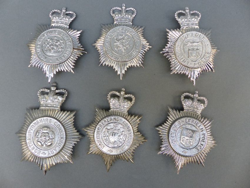 Ten police helmet badges including Shropshire, Liverpool and Bootle, Mid-Anglia Constabulary, Joint Norfolk, Gwynedd, West Sussex, Somersetshire, City of Sheffield etc