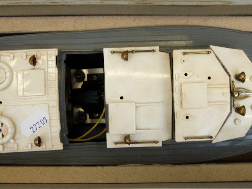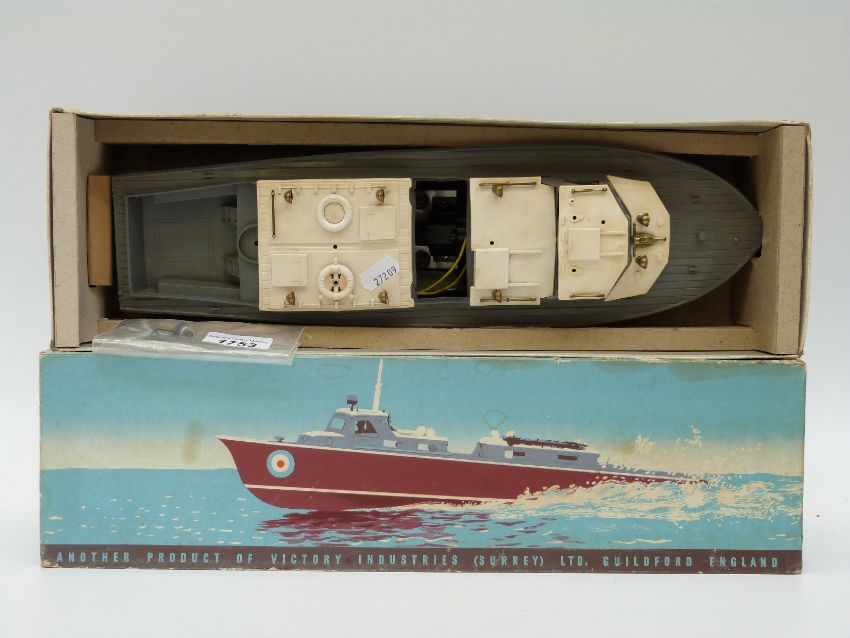 Victory Models Vosper RAF Crash tender battery operated boat with black hull, grey deck and white roof, in original box