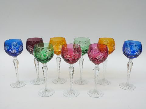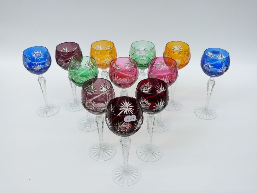 A set of 12 flash overlaid cut glass hock glasses with faceted octagonal stems and star cut bases, 21cm tall