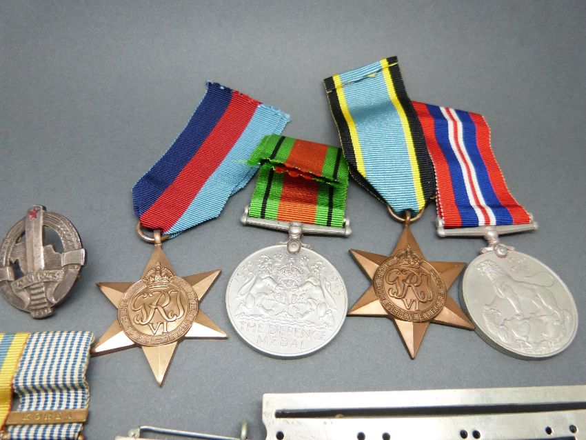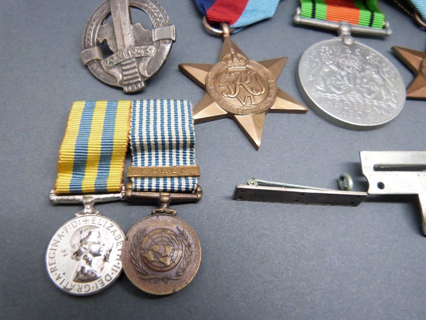 A group of four WWII medals including Air Crew Europe, a 29 xI 1943 Yugoslavian Serbian communist police cap badge and a pair of miniature medals comprising Elizabeth II Korea model and UN medal with Korea clasp.