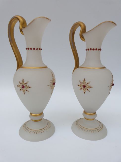 A pair of glass decorative ewers with jewelled decoration, 35cm tall