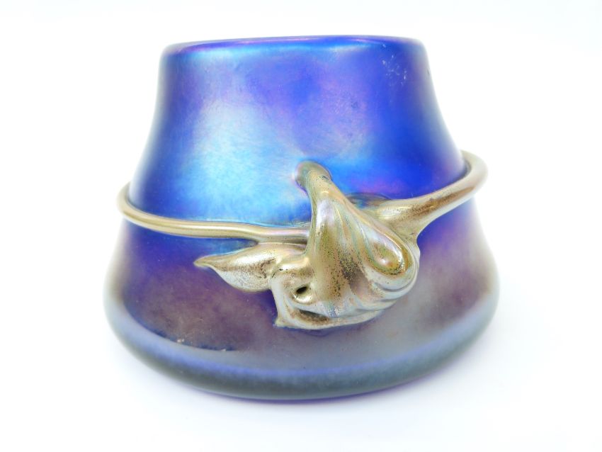 A Loetz /Kralic style iridescent glass bowl of tapering form with applied tubular decoration, 10cm tall