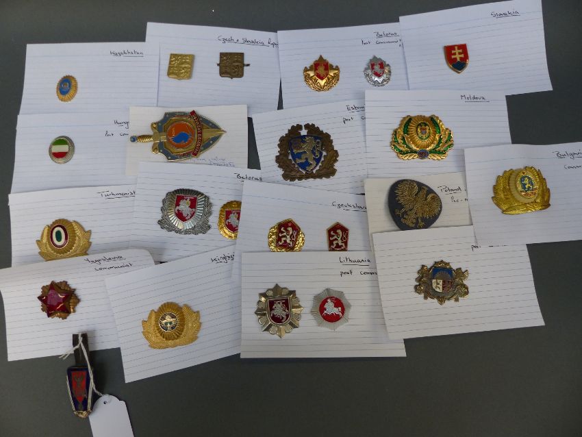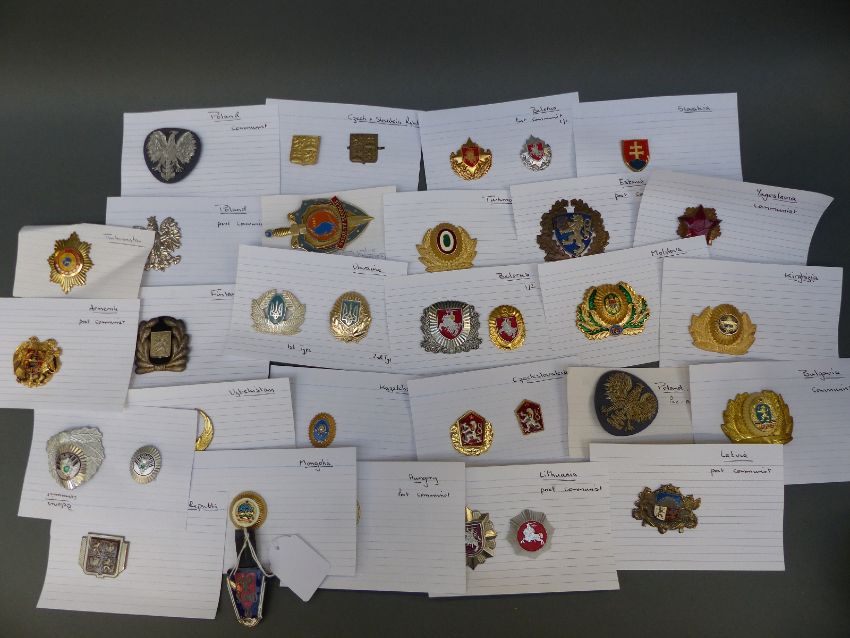 A collection of police badges relating to old Soviet bloc countries including Estonia, Poland, Moldova, Czechoslovakia, Mongolia, Bulgaria, Hungary, Latvia etc