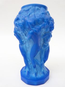Bohemian blue malachite glass vase decorated with nude figures around grape vines.