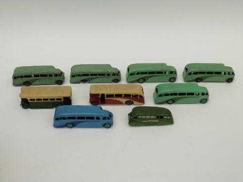 Nine Dinky Toys diecast model single deck buses, five in mint green, one in pale blue, one in cream over red, one in cream over green and one earlier model in two tone green