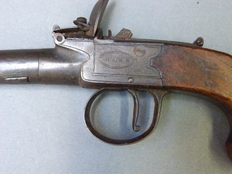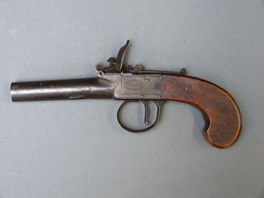 John Bass of London flintlock hammer action pistol with named lock plates, shaped grip and 2.5 inch screw off barrel, overall length 18.9cm.