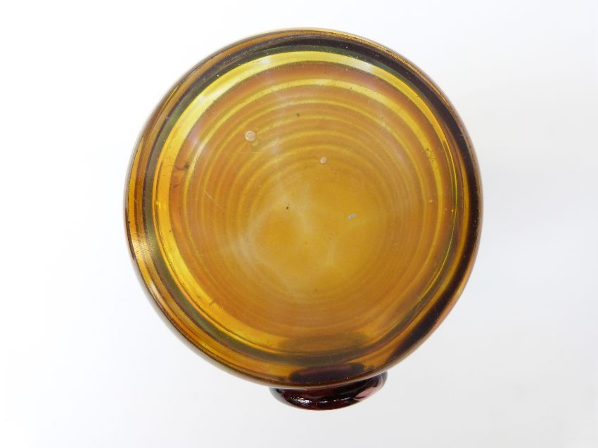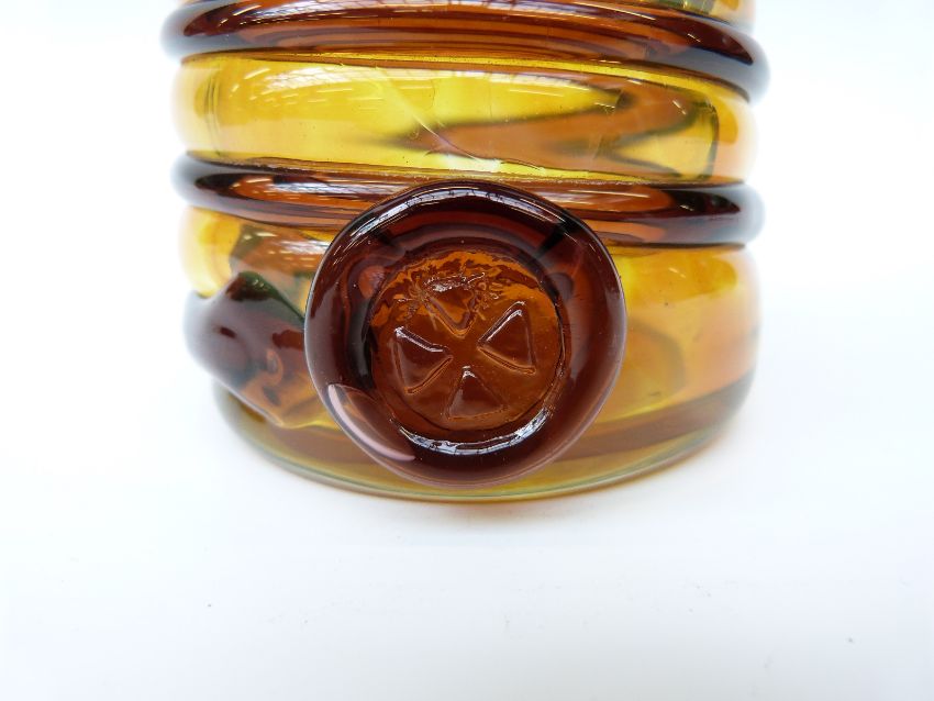 Two Mdina glass vases, one amber with applied spiralling decoration and Maltese cross roundel (16cm tall) the other in the textured bark pattern with collared neck, 12cm tall