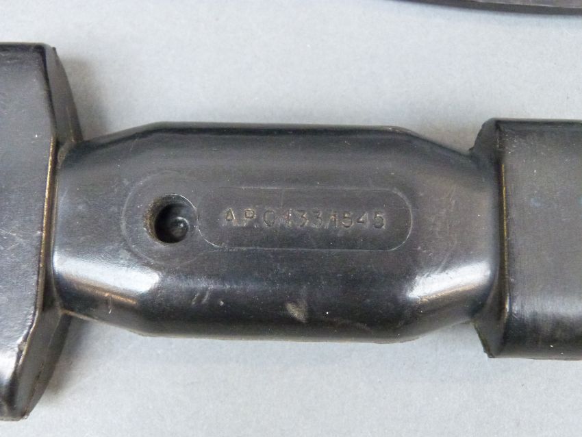 A naval diving knife in rubber sheath marked A.P. 0433/1546 and knife marked similarly but 1545, as used by Royal Navy divers including SBS (Special Boat Service)