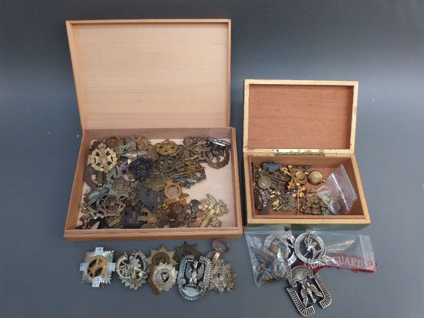 A collection of 50 British army cap badges together with a collection of lapel badges and buttons