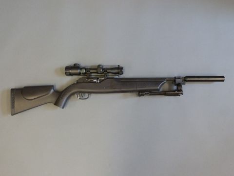 Umarex 850 Airmagnum .22 air rifle with sound moderator, folding bipod and 1.25-4.5x26E scope, serial number G012070 in hard carry/flight case