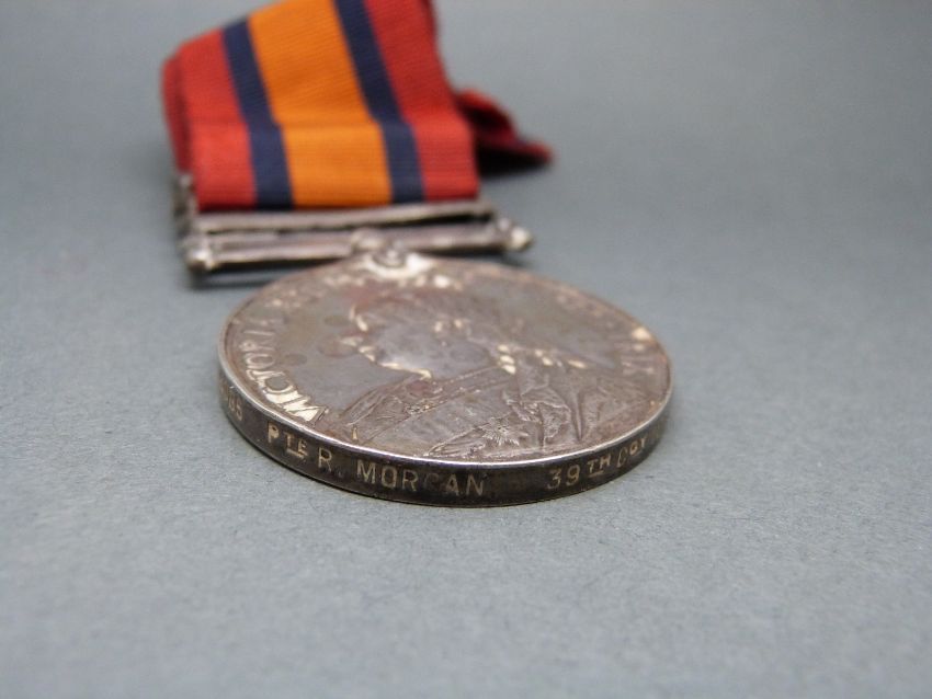 A Queen Victoria South Africa medal awarded to 6085 PTE R. Morgan 39th Coy 10th IMP YEO with three bars - Transvaal, Orange Free State and Cape Colony