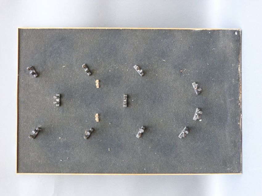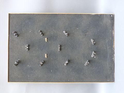 A purpose built powder flask display board with clips for 14 flasks.