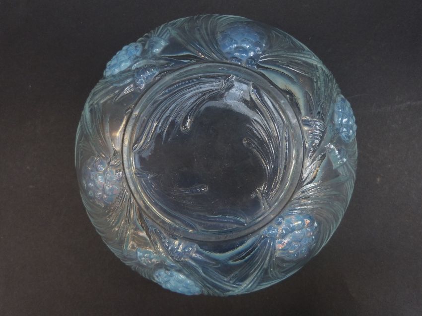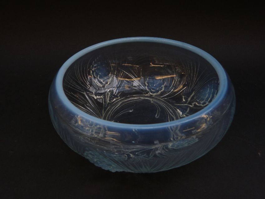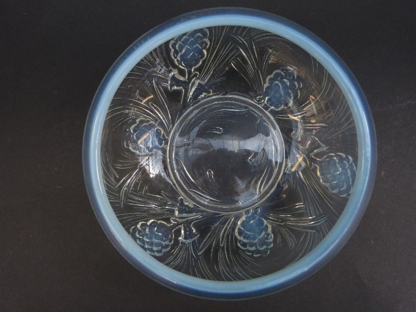 Jobling opalescent pressed glass bowl decorated with pine cones amongst foliage, registered design number 777133, 17cm in diameter