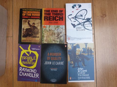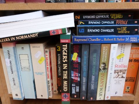 A collection of World War II related paperback books together with novels by John le Carre and Robert Ludlum, approximately 60 titles