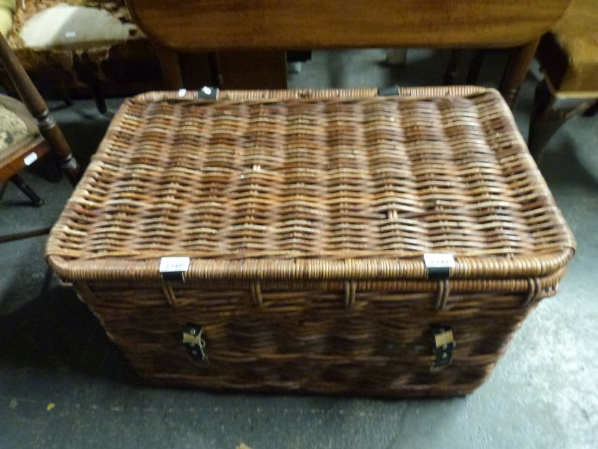 A wicker basket or large hamper with leather straps and looped wicker handles (H45 x L75 x W47cm)