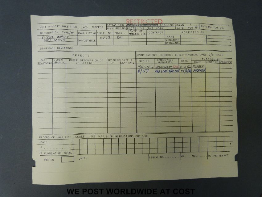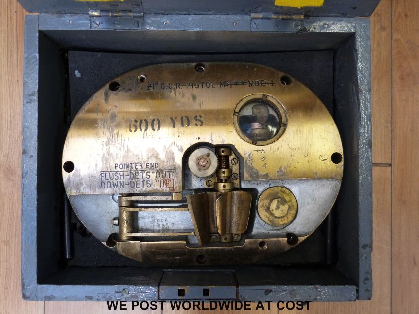A WWII 21" torpedo fuse in original box with paperwork giving recent service history and lifting bars