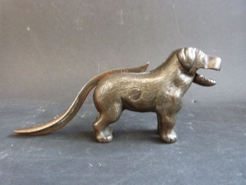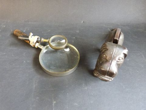 A nutcracker in the form of a dog, together with two vintage magnifiers
