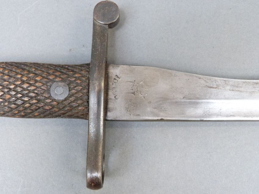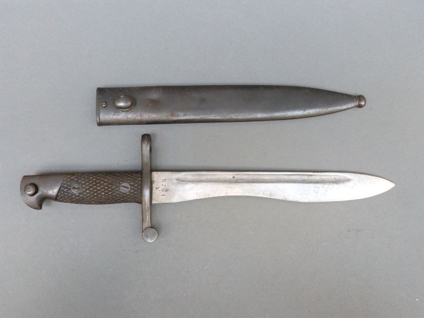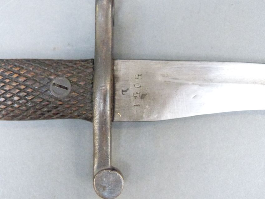 A Spanish Bolo bayonet impressed 5051 to blade in metal scabbard