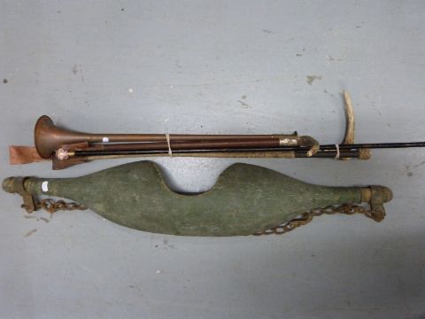 Three vintage riding crops, a walking cane with ceramic top, possibly French and a yoke