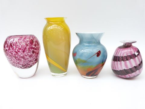 Four coloured glass vases including a Ronald Stennett Wilson vase with purple flecks and a French studio glass vase with original label, largest piece 20cm tall