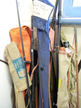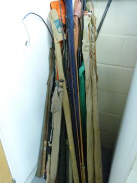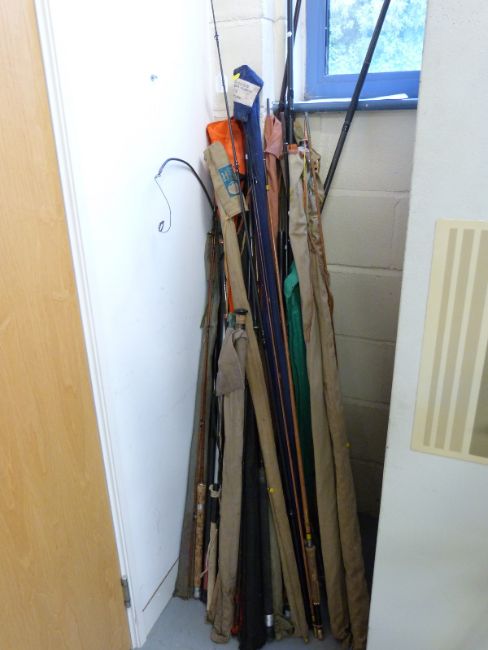 A quantity of fishing rods including carbon Hiline quiver, vintage fibreglass and cane, carbon wading stick, tailer etc