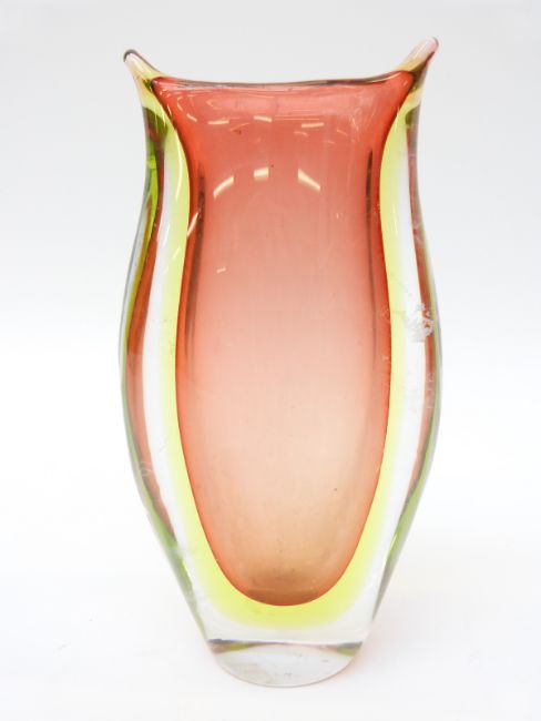 A double lined green over salmon pink vase, unsigned but in the style of Orrefors, 17.5cm tall