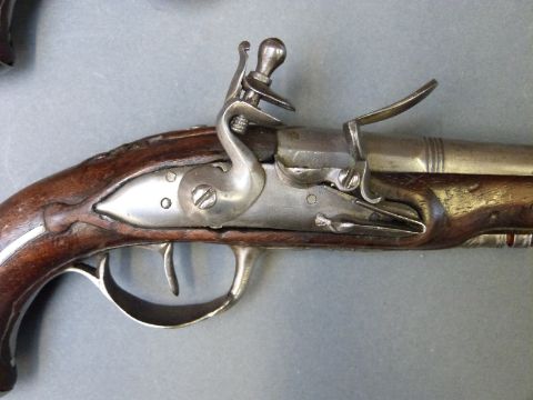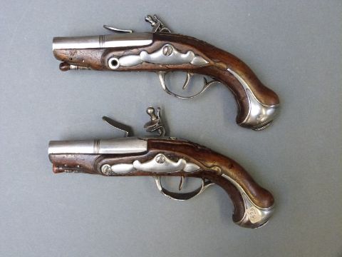 A pair of French flintlock hammer action pocket pistols with ornately carved stocks decorated with flowers and three inch steel barrels, overall length 17cm