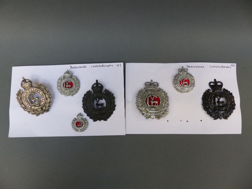 A collection of police badges including Wycombe Borough, Berkshire Constabulary, Windsor Borough etc