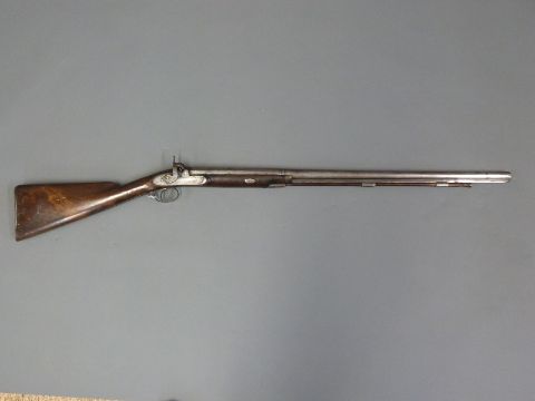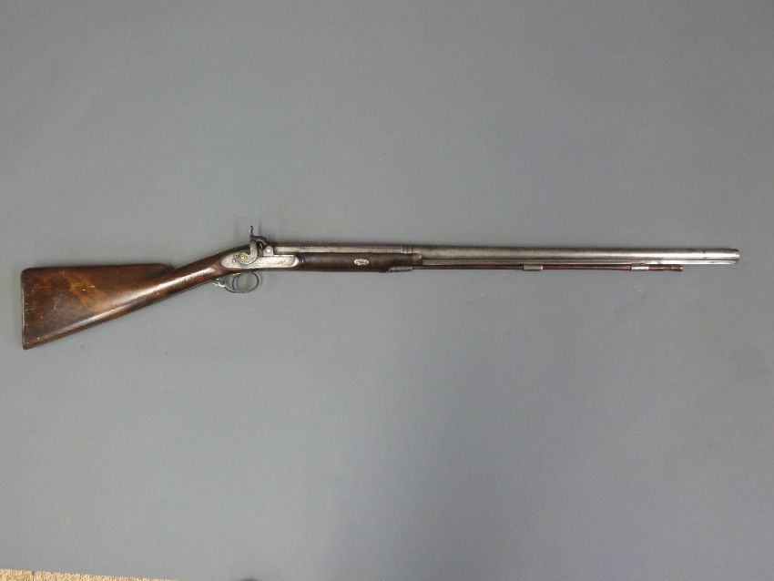 John Cole of Cirencester percussion hammer action gun with engraved decoration to the top plate and stylised dolphin hammer, named and engraved lock with a scene depicting a dog in a field, steel butt plate, trigger guard and mounts, horn tipped forend and named 32 inch multi stage part octagonal barrel, overall length 122cm
