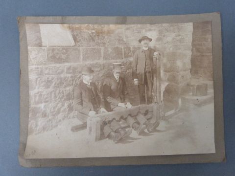 A photograph of the crew of HMS Impregnable together with a framed "Crossing the Line" certificate HMS Renown Australian Cruise 1927, photo of Edwardian gentlemen in the stocks and two bosun's whistles