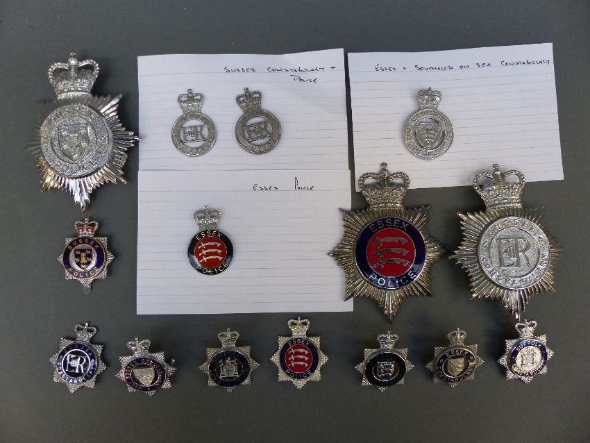 A collection of police badges relating to Essex, Suffolk and Sussex Constabularies