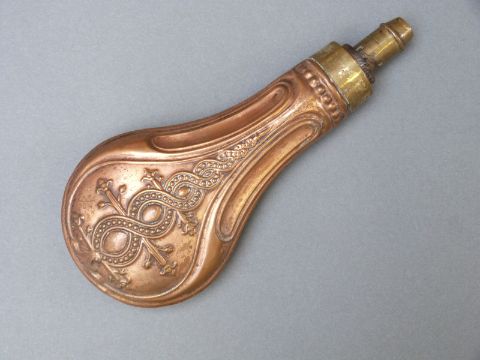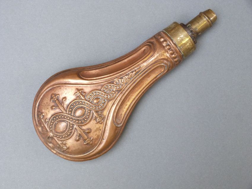 Copper and brass powder flask with embossed spiralling decoration, 20cm long