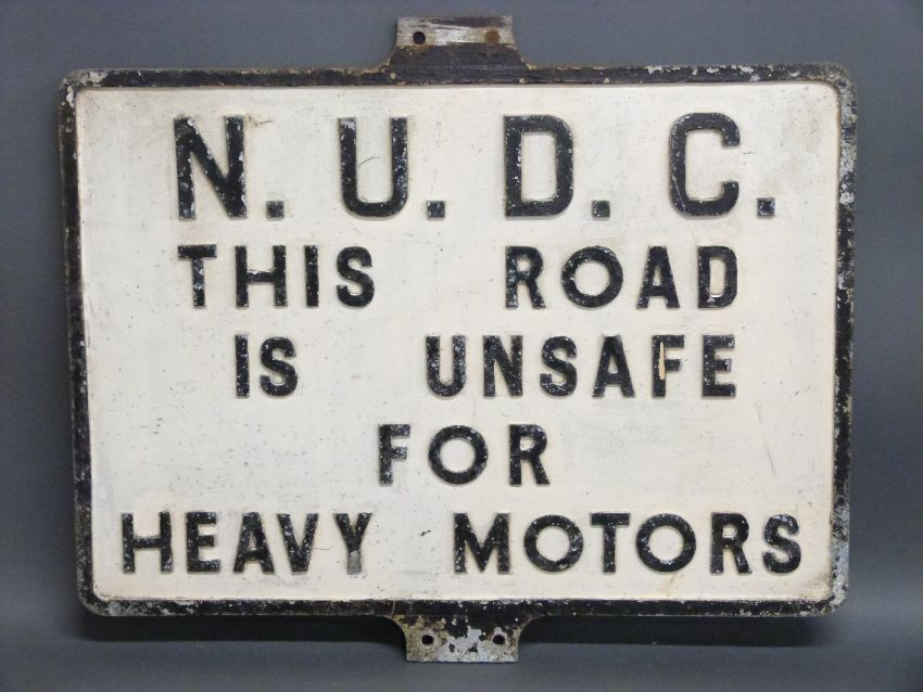 A vintage cast aluminium 'N U D C this road is unsafe for heavy motor vehicles' sign, 51 x 61.5cm, possibly local Nailsworth interest