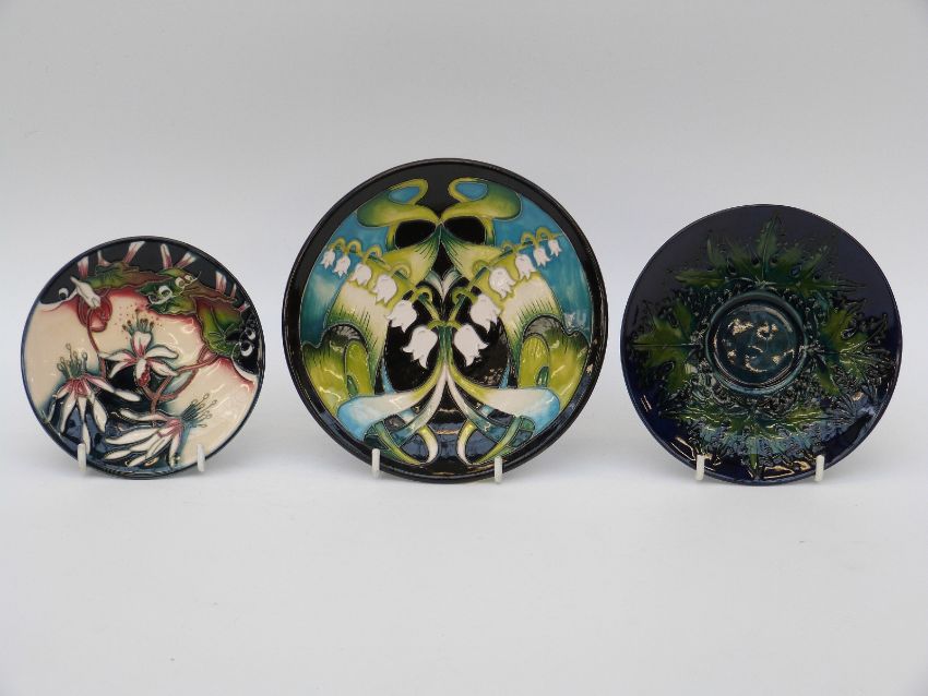 Moorcroft plate in Green Glade pattern by Nicola Slaney together with two Moorcroft dishes with snowdrop and buttercup designs