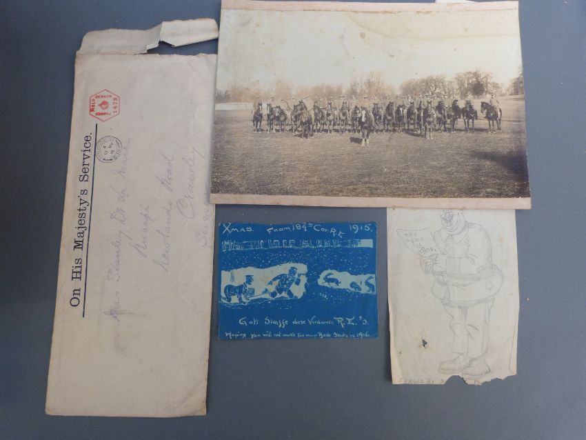 A quantity of WWI ephemera relating to Stanley H. De La MareStanley de la Mare was born in 1876 and served with the British South African Police for 12 months, leaving in 1898 and joining the 49th Company Imperial Yeomanry to fight in the Boer War. He was then commissioned into the Montgomeryshire Yeomanry on 10/10/1914 and was mentioned in dispatches on 13/11/1916. He served with the Royal Engineers Tunnelling Company from November 1915 to March 1918 and after the war served with the 53 Welsh DivisionComprising army service record, enrolment in the British South African Police, cards, menus from reunions etc relating to both the Montgomeryshire Yeomanry and Royal Engineers tunnelling company, various pencils cartoons, photographs etc and also a quantity of items relating to merchant navy seaman George Gallie who died at sea in 1922 including his certificate of discharge, correspondence between the shipping company and Gallie's widow, also various silk and other postcards. See also lot 1447 and 977 relating to De La Mare.