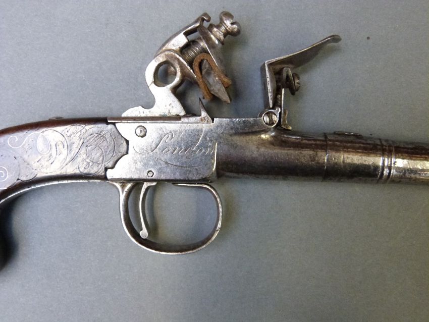 Ketland & Co of London Queen Anne flintlock hammer action pocket pistol with silver wire inlay and white metal cartouche to the walnut stock and four inch screw off cannon barrel, overall length 21cm