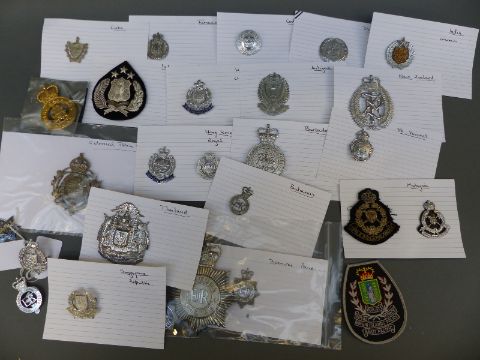 A collection of police badges relating to Malaysia, Singapore, Hong Kong, Thailand, Indonesia, multiple Caribbean islands, Cuba, Barbados, Virgin Islands, Bermuda, Dominica, Trinidad and Tobago and a Colonial Police Service badge