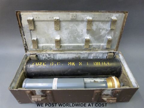 A boxed circa WWII charge drill fuse in case with original storage tube, length of case 58cm