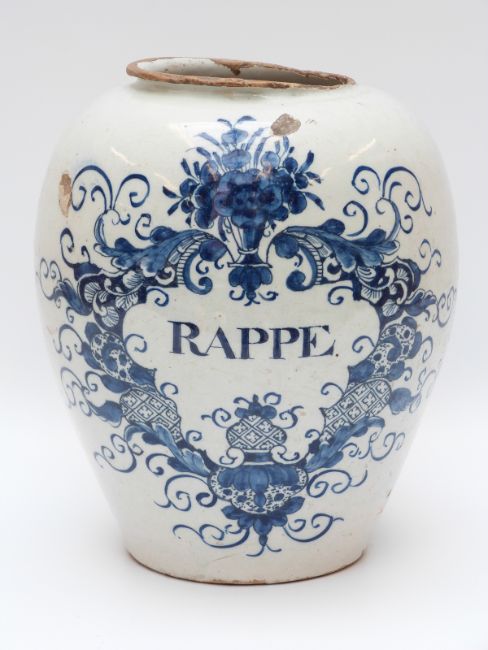 An 18thC apothecary jar with hand decorated 'Rappe' inside a floral cartouche (24cm tall)